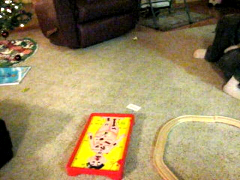 Tot boy hits a Jack in the Box toy on dad's lap in the living room with a bat, he hits Dad's groin / crotch.