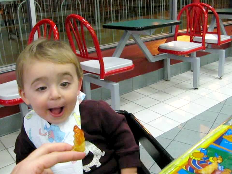 Tot boy has a surprised look on his face when he tastes ketchup on a French Fry at a restaurant. First foods.
