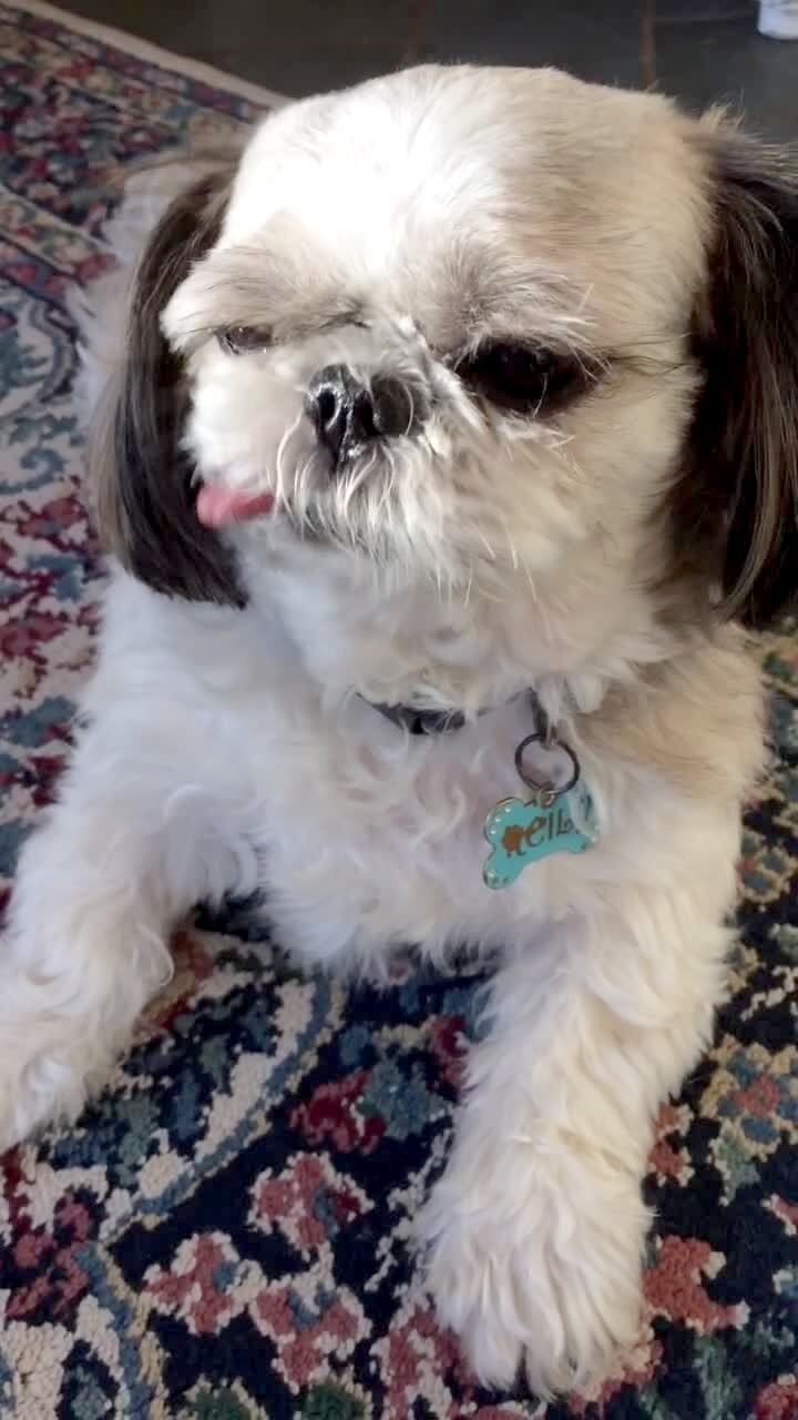 A pug dog licks its lips in slow motion with a long tongue at home.