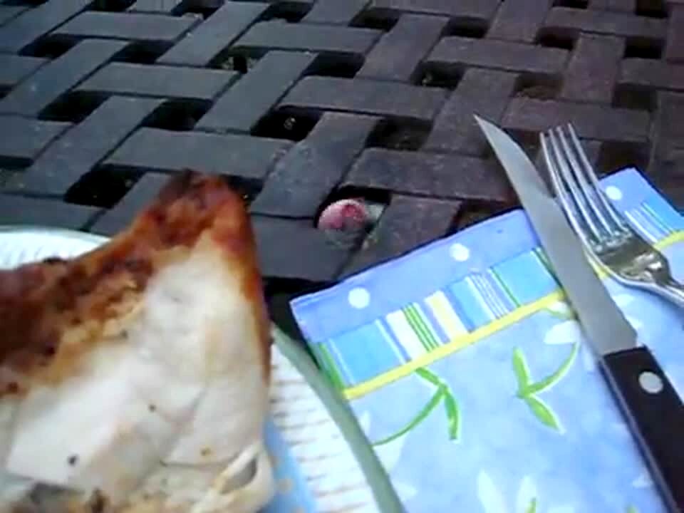 Dog sits under picnic table while family eats. Dog licks through table holes to get food. All you see is a tongue sticking out, then a reveal of cute white puppy.