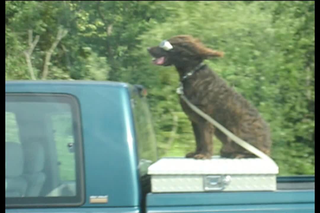 "Pickup Pooch" Dog with goggles on rides in the back up a pick up truck.