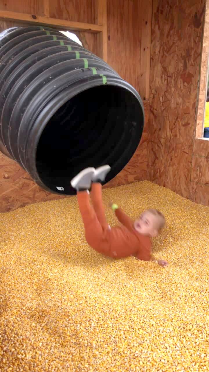 A young girl runs and jumps into an inflatable pool. A tot boy then runs to jump into the pool while holding a small inner tube and pool noodles, but jumps to early and ends up on the ground outdoors.