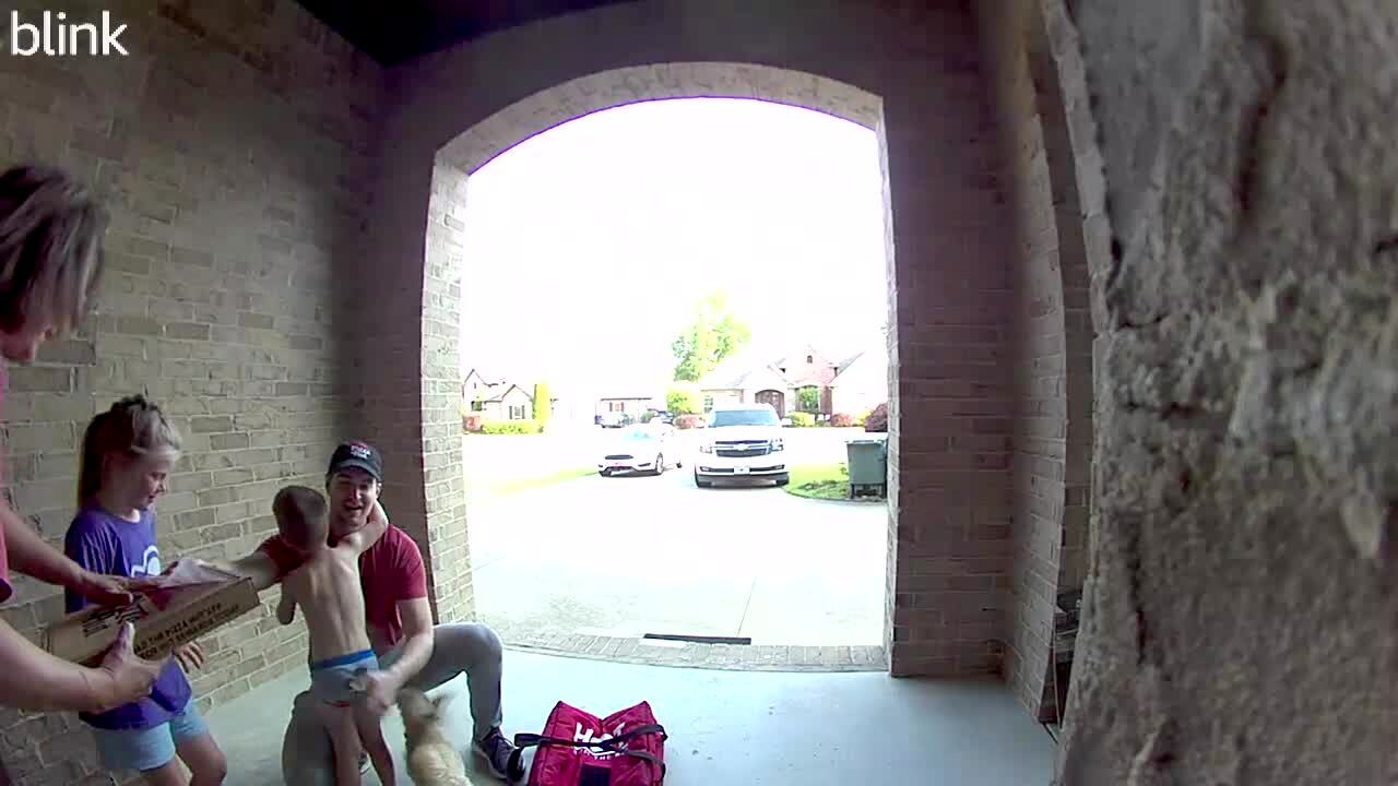 A young boy carries a pack of toilet paper then runs into the edge of the door and falls back onto porch. His mom starts laughing at him.
