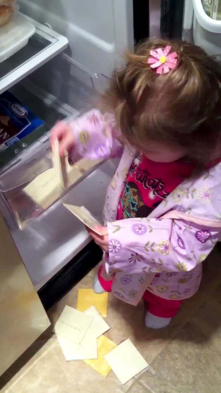 A tot girl pulls plastic-wrapped cheese slices out of a refrigerator door at home, licks them individually, and then drops them on the floor.