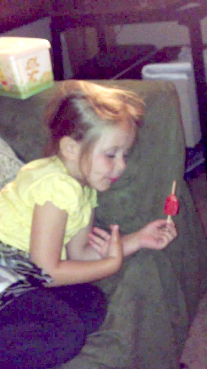 A tot girl falls asleep while eating a Popsicle indoors, drops it, and sucks her thumb.