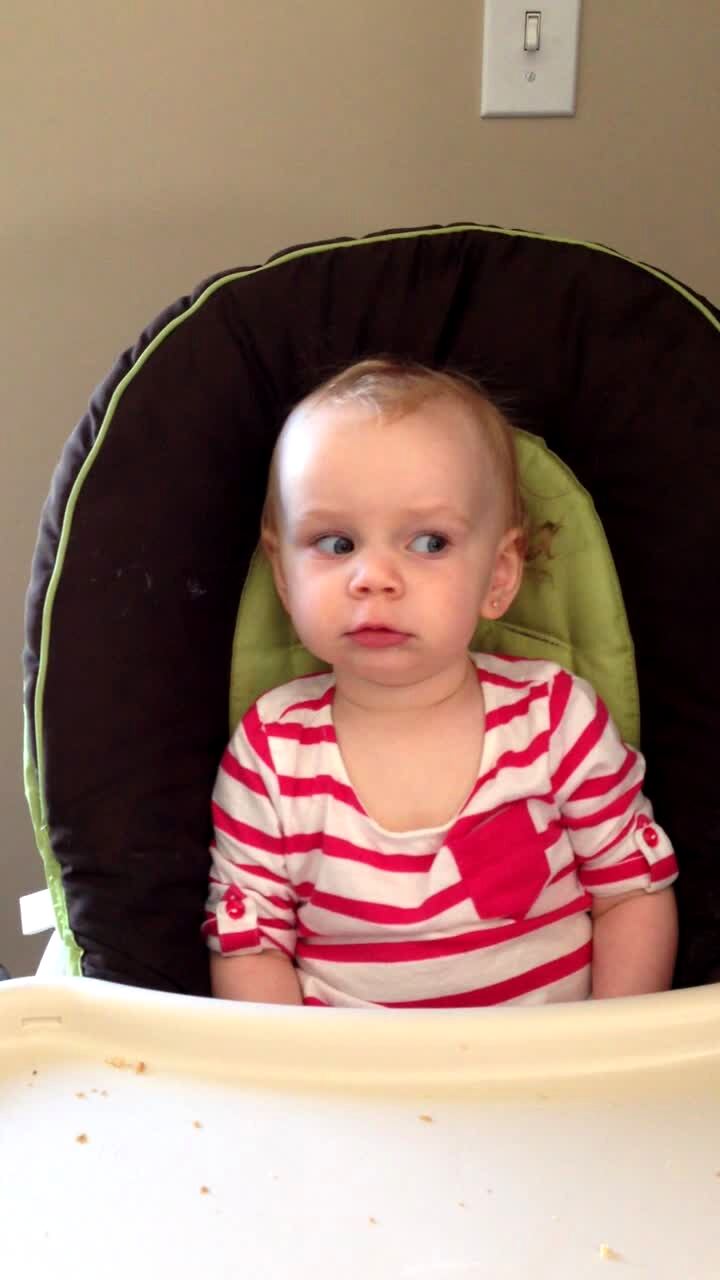 A tot girl in a high chair gapes and then begins laughing when her mother offers her Cheerios.