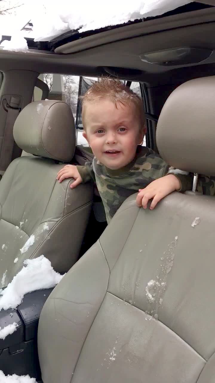 A mother and a father sing "Silver Bells" in the car as a tot boy screams and throws a tantrum in his car seat.