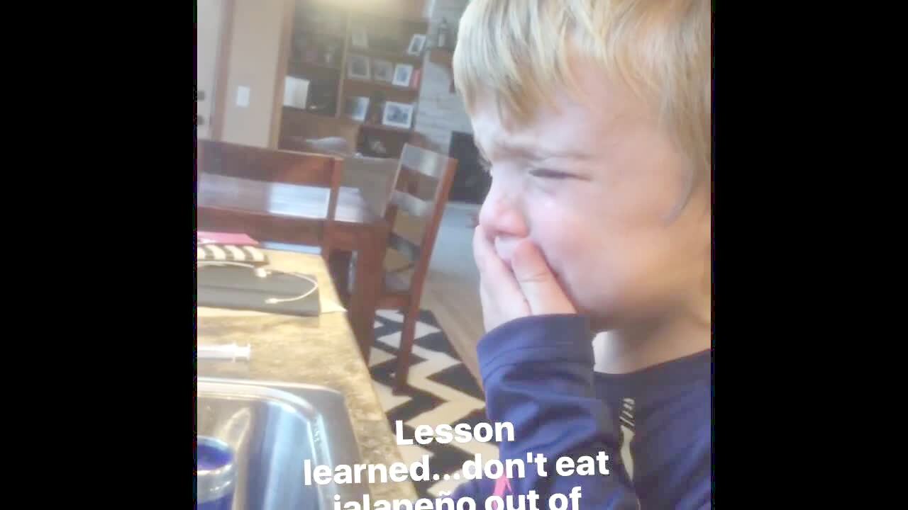 A tot boy drinks water from the sink and cries. He cries and talks to the camera. His mother explains that he ate a jalapeno out of the neighbors garden.