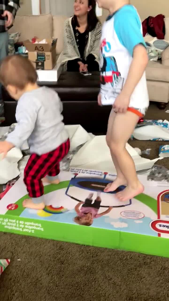 A tot girl opens a Christmas present and receives a trampoline. She then climbs on the box and jumps on the box.