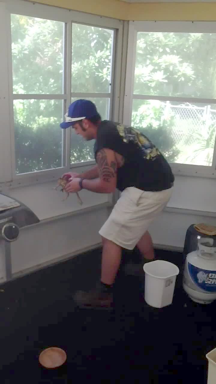 A man in a black shirt finds a frog indoors. He calls a man with a blue shirt into the room and picks up the frog. The man in blue calls a woman into the room, saying that there's something wrong with the grill. A woman enters the room and the man in black holds the frog out to her. The woman screams and runs out of the room. A tot girl and a Bichon Frise dog are also visible. The woman yells at the man in black and then screams when she sees the frog still indoors.