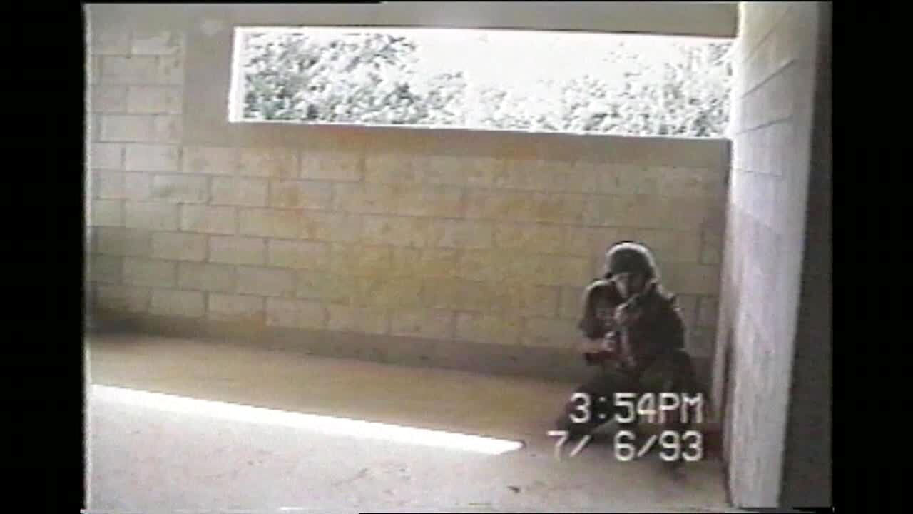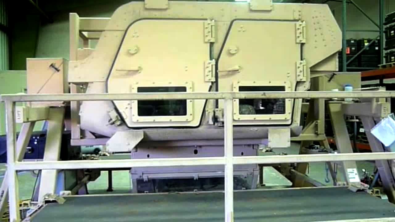 Soldier trains in a roll over simulator, he's dizzy and can't get out. He falls over face first. Military.