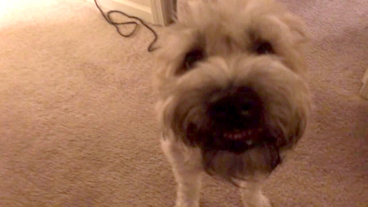 "Mugging Mutt" A woman films her dog's poop on the carpet, then turns to her dog to scold him and he bares his teeth in a smile.