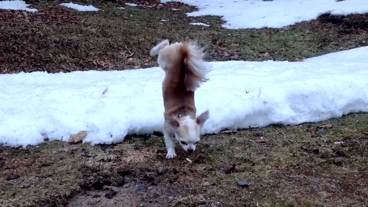 A chihuahua dog approaches a patch of snow and lifts his hind legs, walking on his front legs as he pees in the grass.