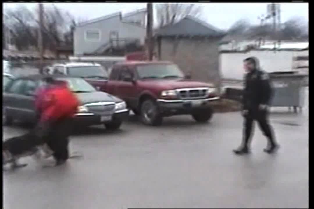 Police dog attacks man with a padded suit on in the arm. Dog lets go & bites him in the groin / crotch & man screams. Training.