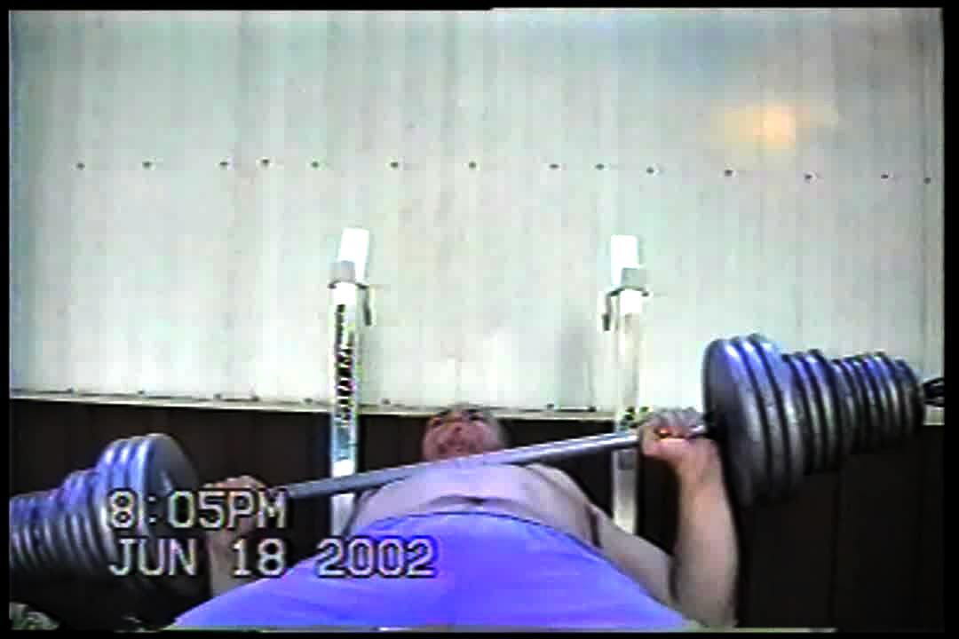 "Workout Wipeout" Man lifting weights can't push bar back up, weights fall on him.