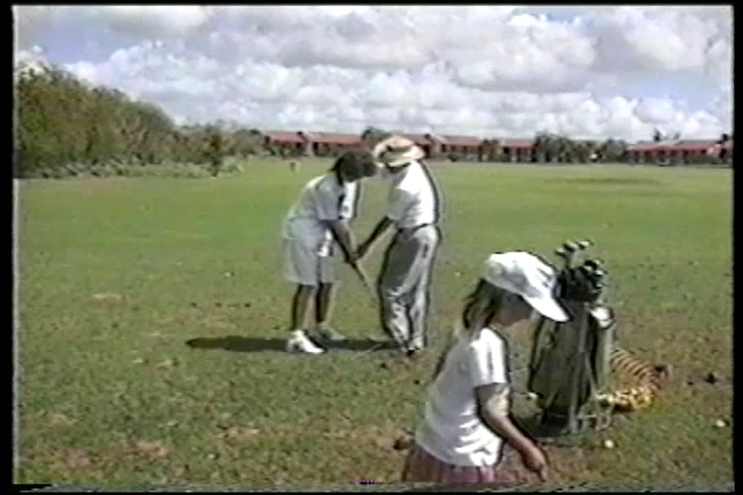 In a living room, a grandpa attempts to show his granddaughter how to use her back-handspring trainer when he leans back and topples over backwards.