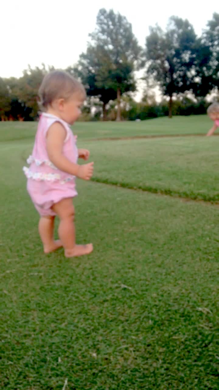 A tot girl walking on a golf course in the background falls into a sand trap hole. A baby girl in the foreground sits on the grass and babbles.
