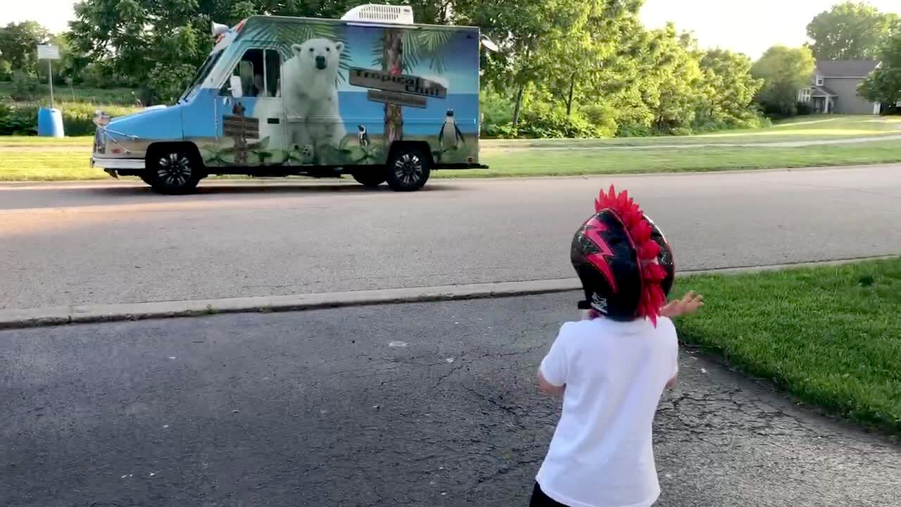 An ice cream truck goes through the neighborhood. A young boy watches as it pass. A woman asks "what is that?" and he says it's the "music truck." He waves at the truck as it goes by.