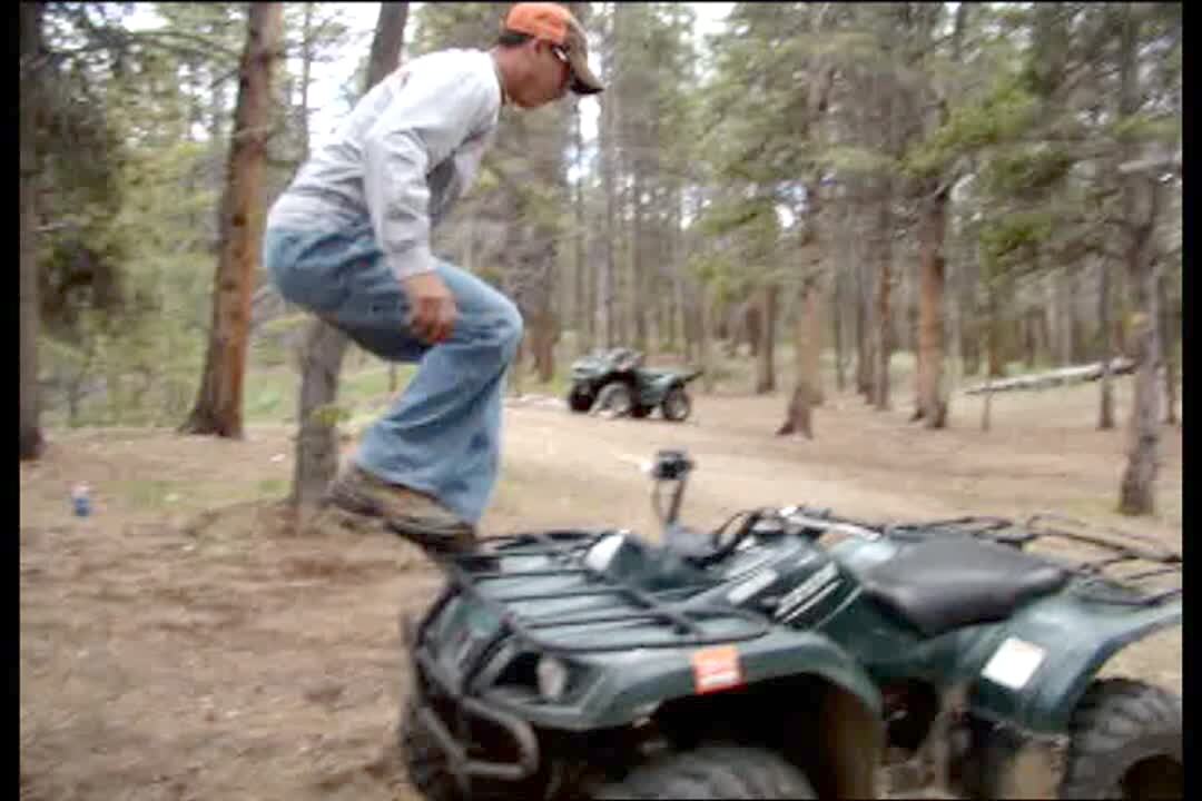 Man jumps onto a tree branch from his motorbike and falls down. He's fine. Bonehead.