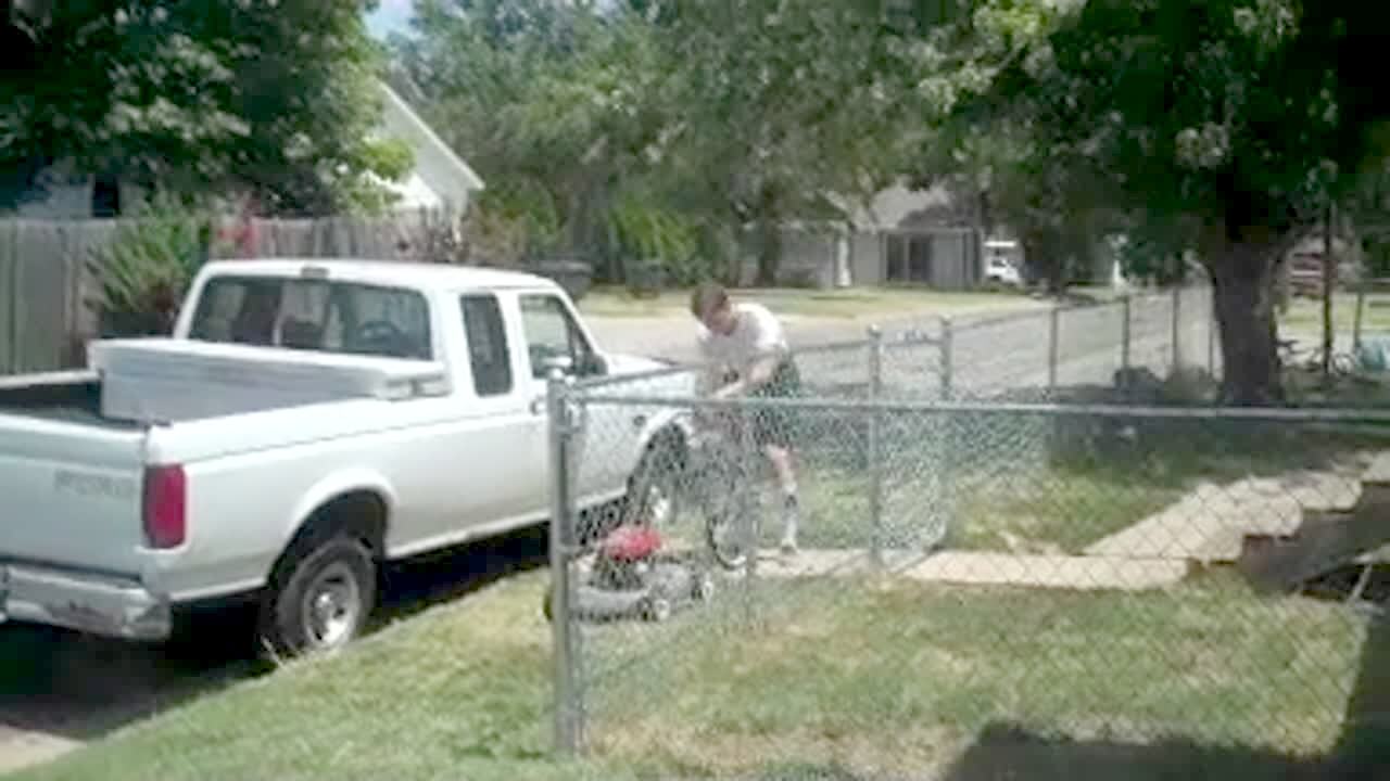 Teen boy jumps on trampoline. He does a flip and gets his head stuck in the springs.