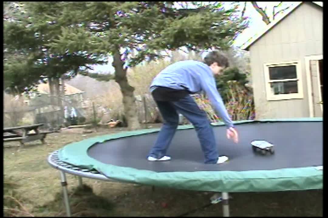 Preteen boy on a skateboard on a trampoline. The skateboard shoots off the trampoline and crashes / breaks a window.