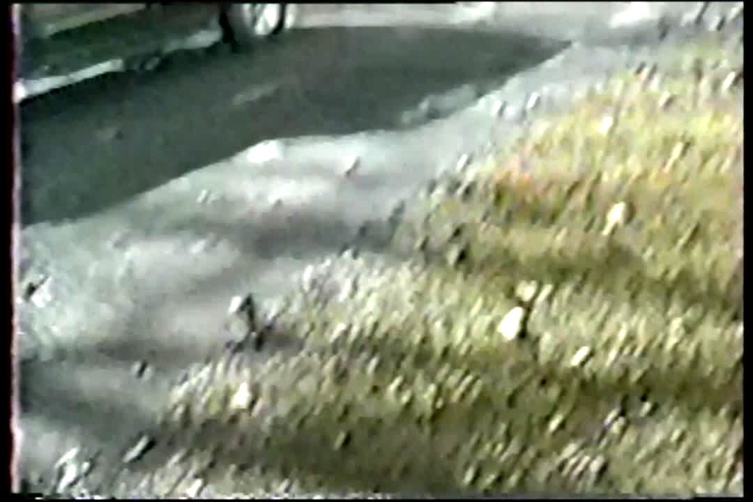 A man pretends to fart on the ground while a broken sprinkler shoots out steam and makes a funny sound behind him outdoors.