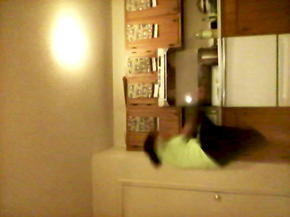 A teen girl dances to a pop song indoors when she slips and falls on the floor.
