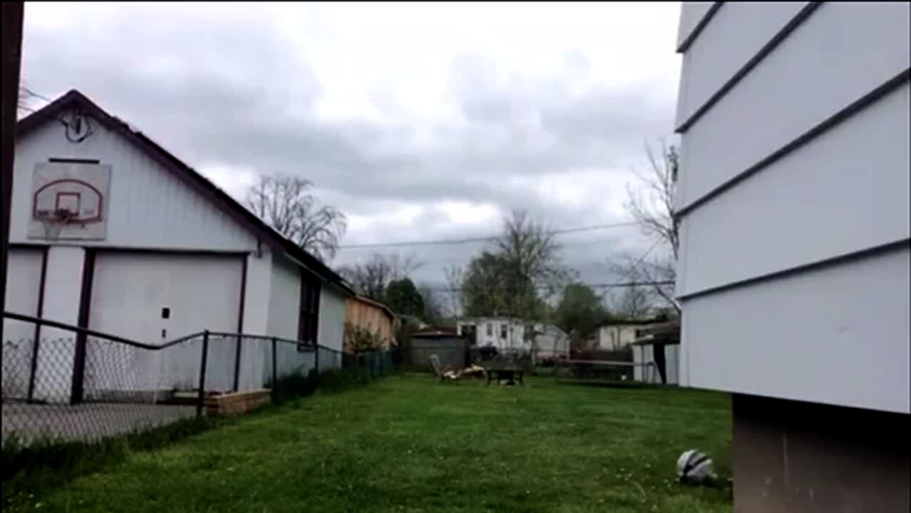 A young boy opens the screen door on the front porch on a windy day and he flies into a planter and falls.