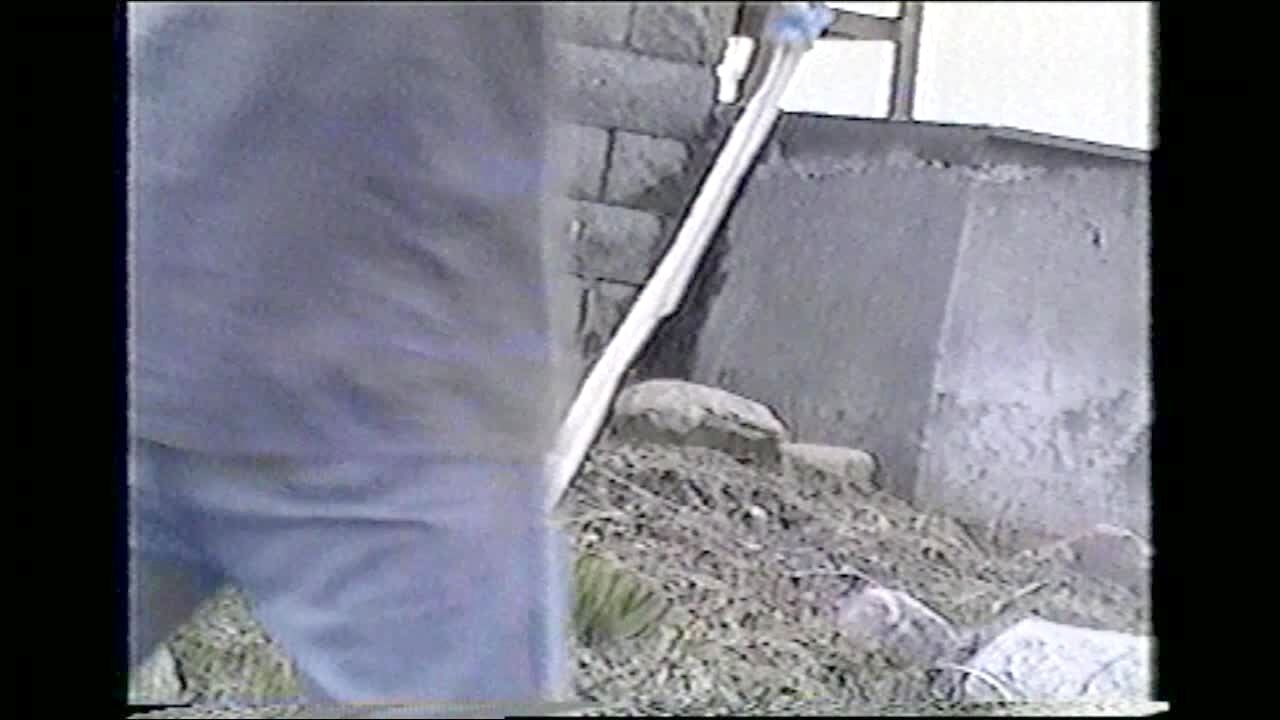 Two men work in a garden and one of the men steps back with a wheelbarrow and trips and falls into a swimming pool. Security camera.