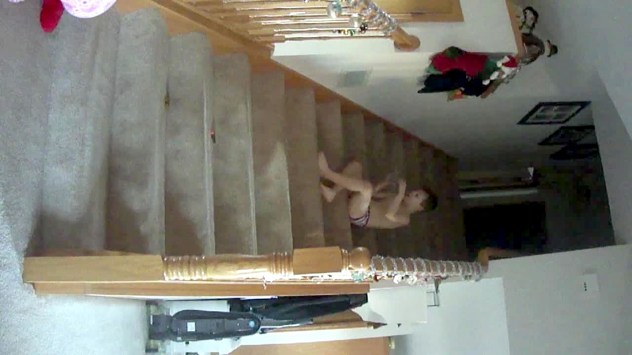 A boy and little girl are coming down the stairs on Christmas morning. The girl trips and flips over. Knocks off one of the Christmas decorations. Ends up saying 'that was fun' Video is sideways.