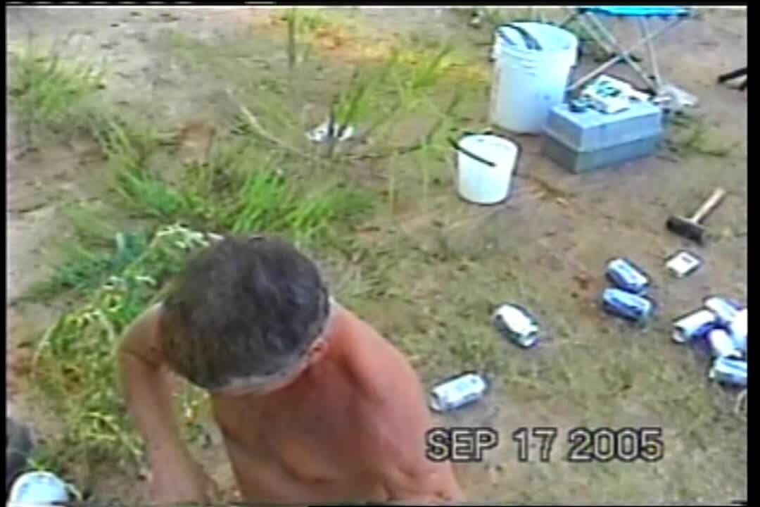Man tries to ride children's bike down drop off and falls into dirt/ mud. He tries it 9 times before he gives up. Drunk man. Long for edit