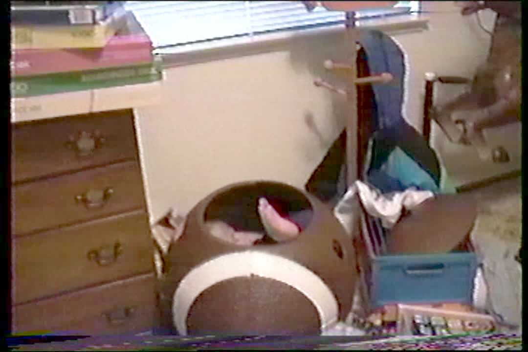 A man in the kitchen leans back in a stool. The back breaks and he falls to the ground while also starling his cat. Security Footage.