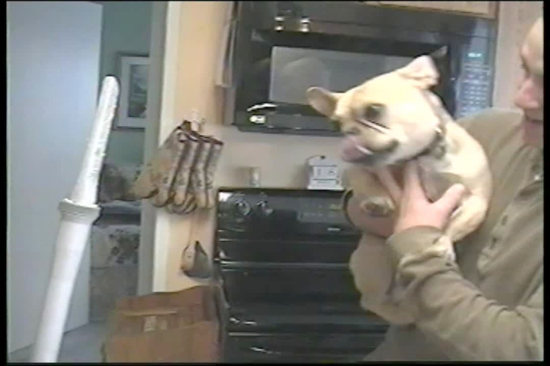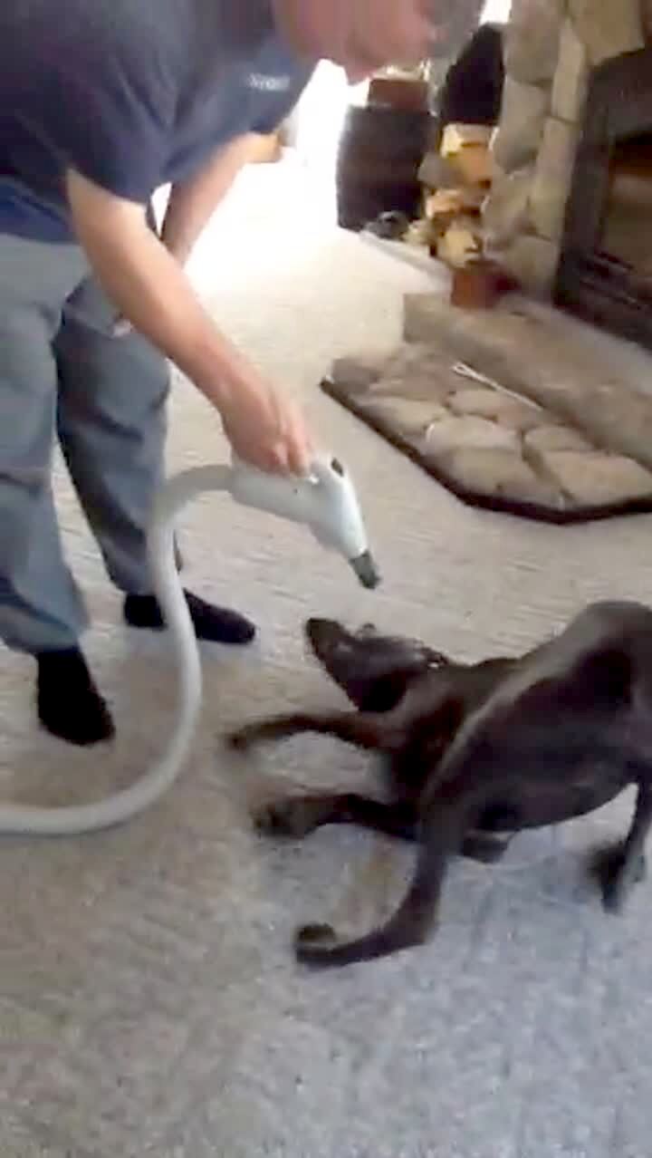Man holds a bull dog and a woman shows it the vacuum. Dog makes a funny screaming sound & goes crazy.