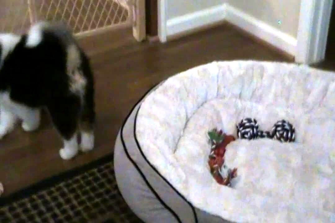 A big white dog and a baby boy hide in a dog cage when mom brings out the vacuum.