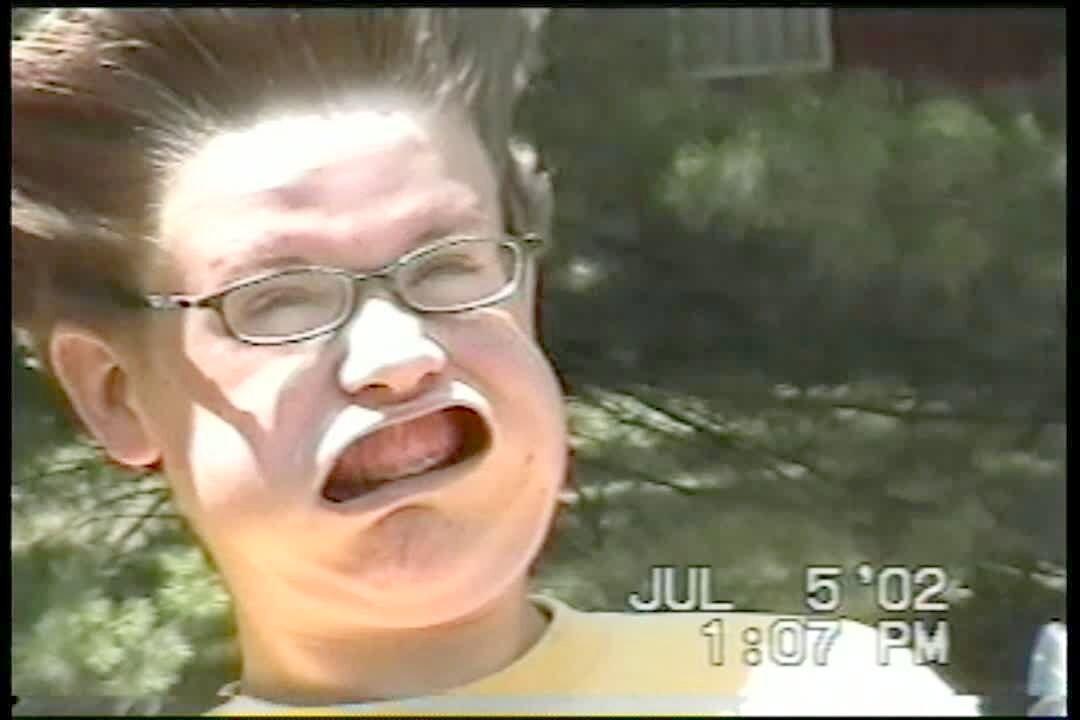 Boy with glasses and braces looks funny when he uses a leaf blower on his face.