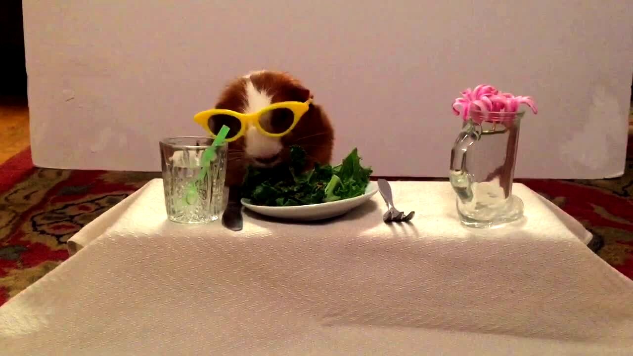 A guinea pig wearing sunglasses eats lettuce off of a small plate at a small table. There is also tiny silverware, a tiny glass of water and a tiny vase.