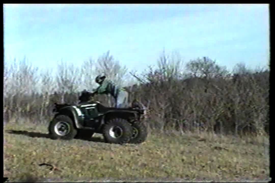 Man rides 4-wheel ATV on his knees, flips it up, & man is thrown over the front of it when it lands. Bonehead. Outdoors. *short tail/ bad tracking