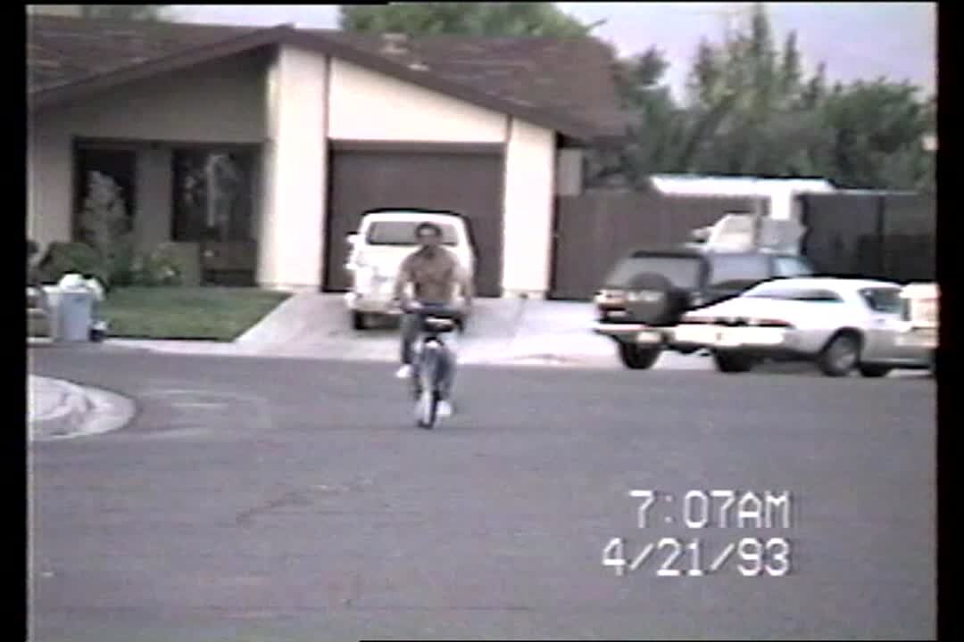 Biking. Man rides bicycle bike "no hands, no feet, no teeth ", then crashes into parked car truck dodge.