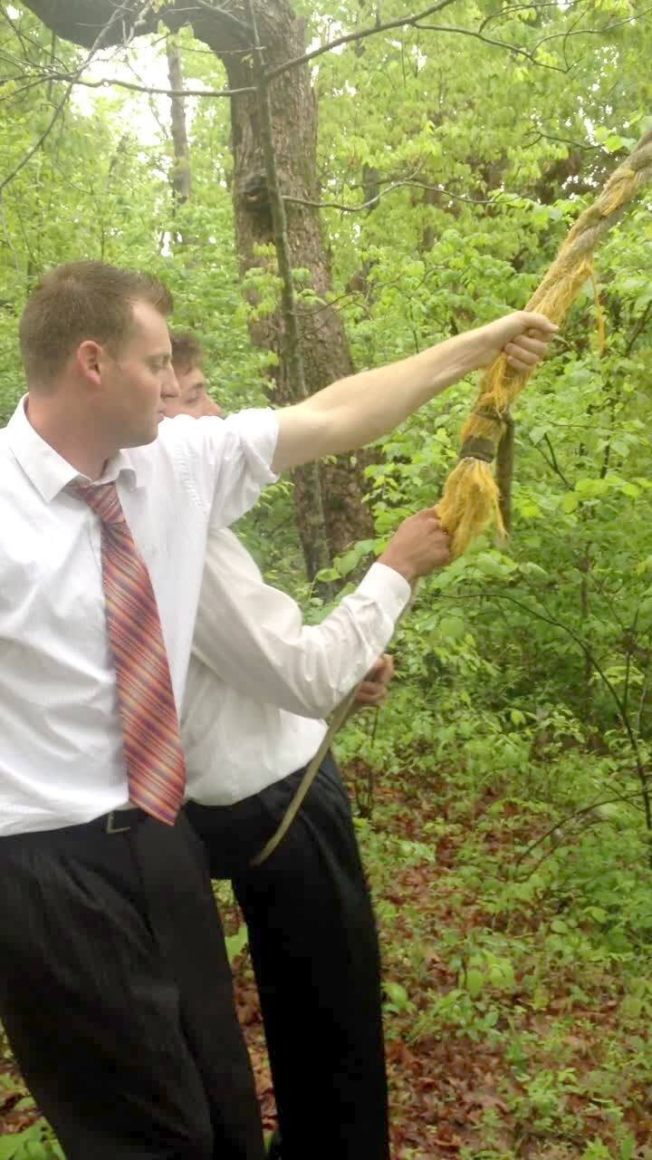 Two young men in white shirts and black pants swing on a vine or branch outdoors while a woman off camera explains what they'll do. Both men swing, but one man loses his grip and falls on the ground behind some bushes.