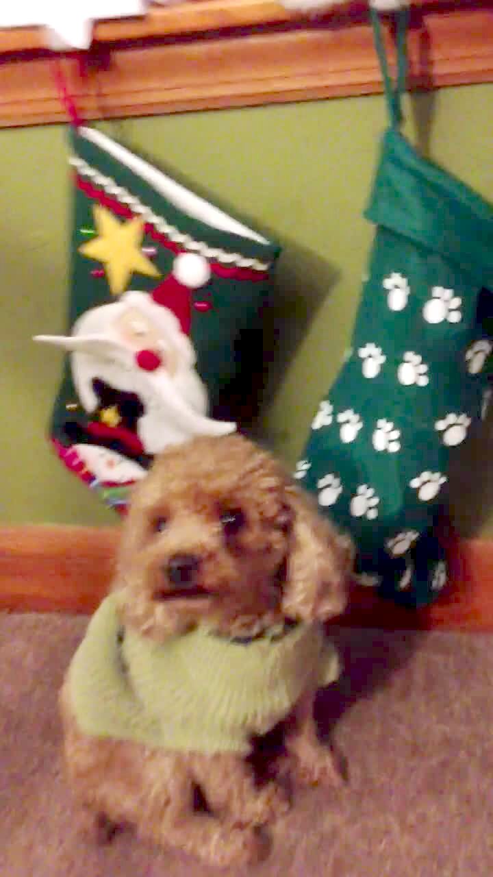 A small dog sits next to a Christmas stocking and growls when a woman reaches for it.