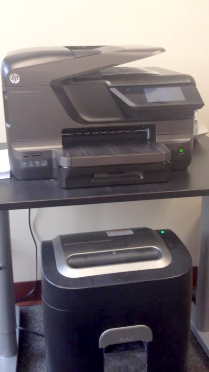 A printer prints out a sheet that falls into a paper shredder at an office.