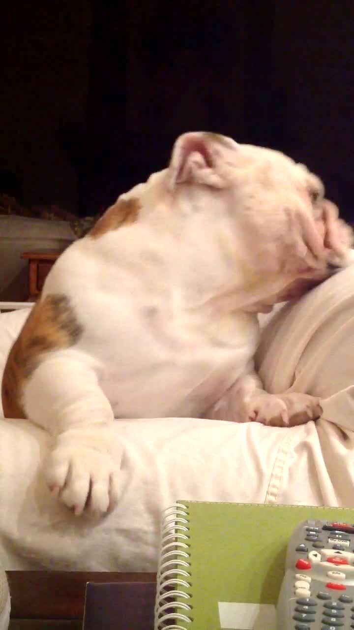 A woman tells her bulldog that she ate all of his Halloween candy. The dog barks and growls.