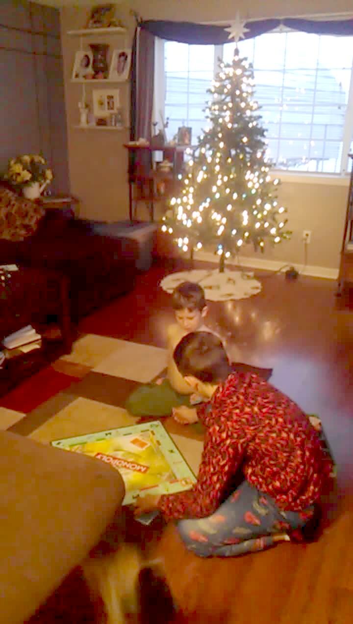 Two boys are playing monopoly at home and one boy screams and cries when he loses saying, "That's not fair! I'm a sore loser!"
