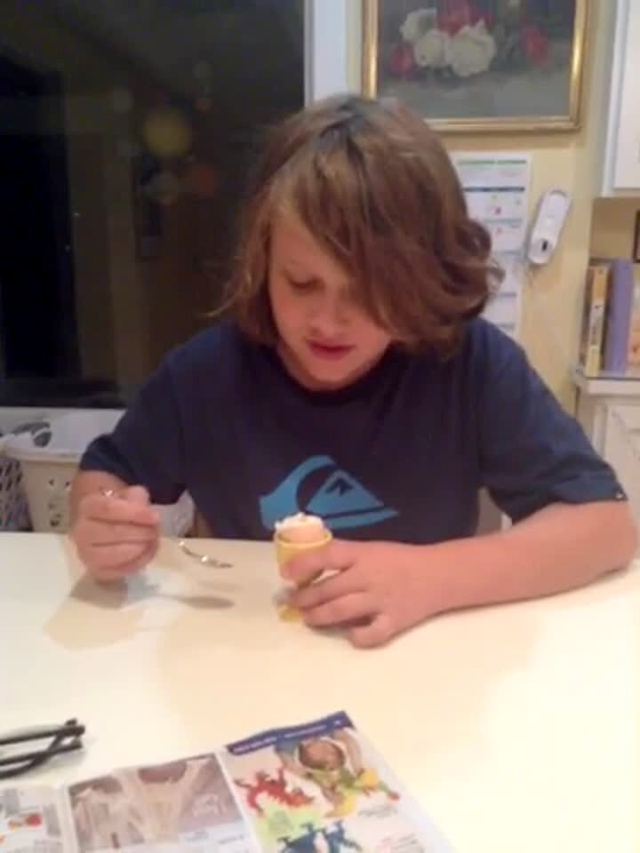 A boy sticks his spoon into a soft boiled egg at home and it explodes, peppering him with egg chunk.
