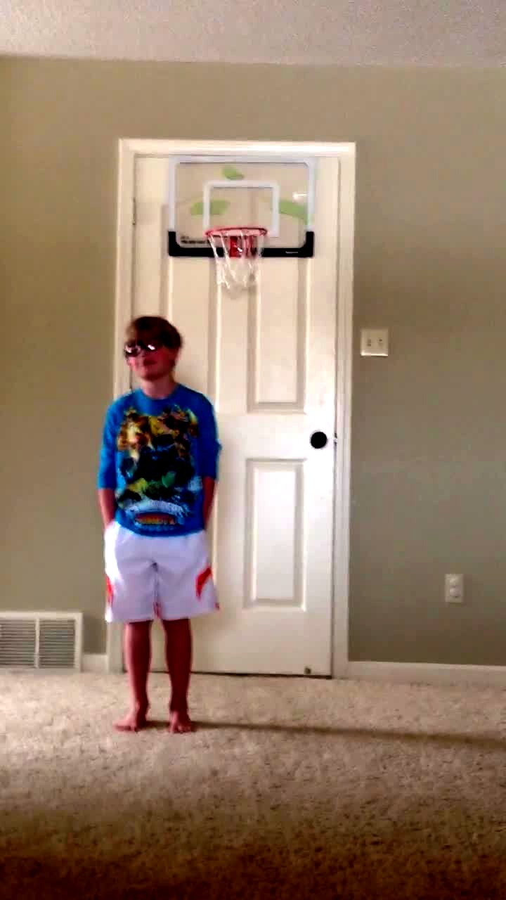 A teen boy tries to jump over a younger boy and dunk a basketball at home and knocks the boy over.