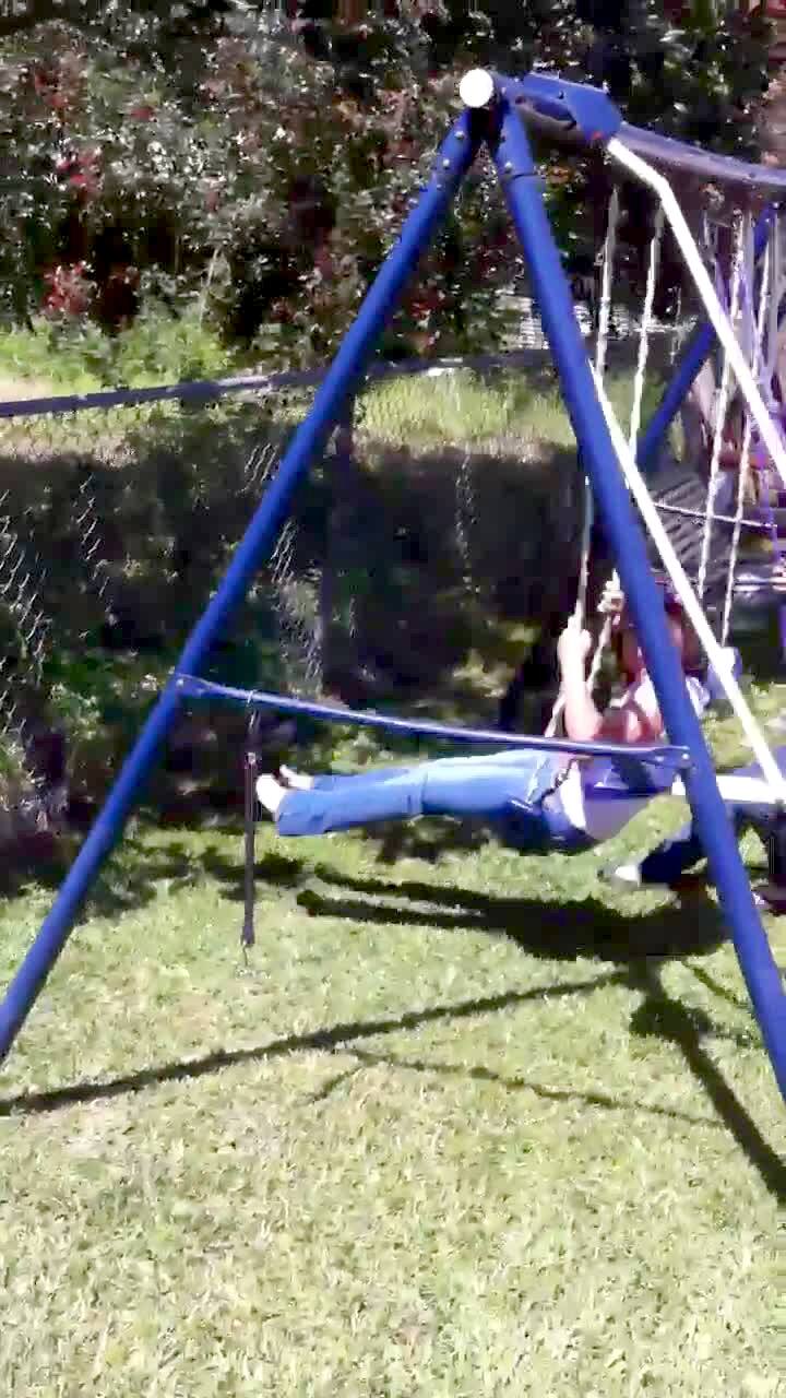 A girl is swinging on a backyard swing set and the front part of her swing gets caught on a fence.