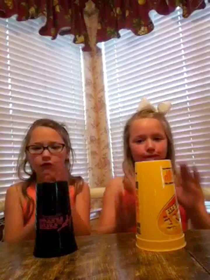 Twin sisters try to do the cup song. One girl drops her cup and the two argue. The girl who dropped the cup hits her sister in the head.