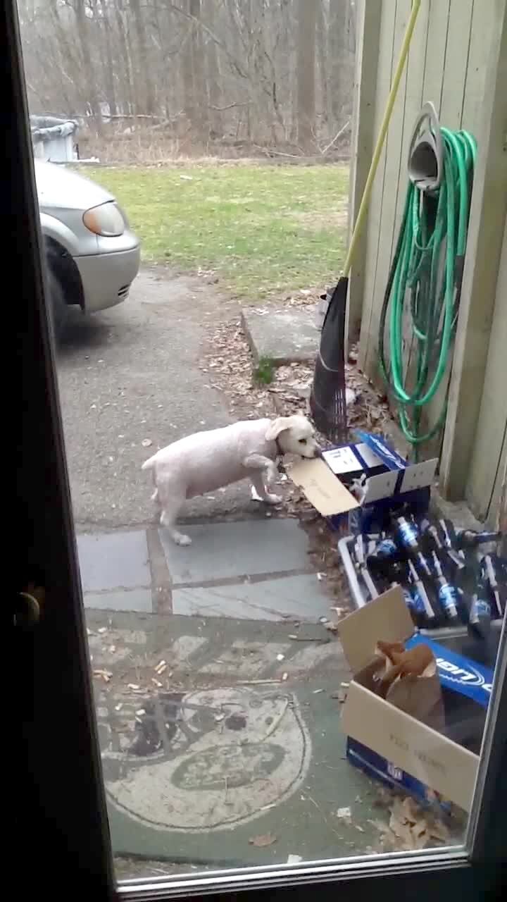 A small dog pulls an empty bottle of beer out of a box at :33 and walks away.