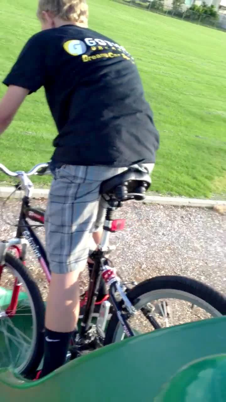 A teen boy tries riding a bicycle down a slide at a park, and falls off of the bike.