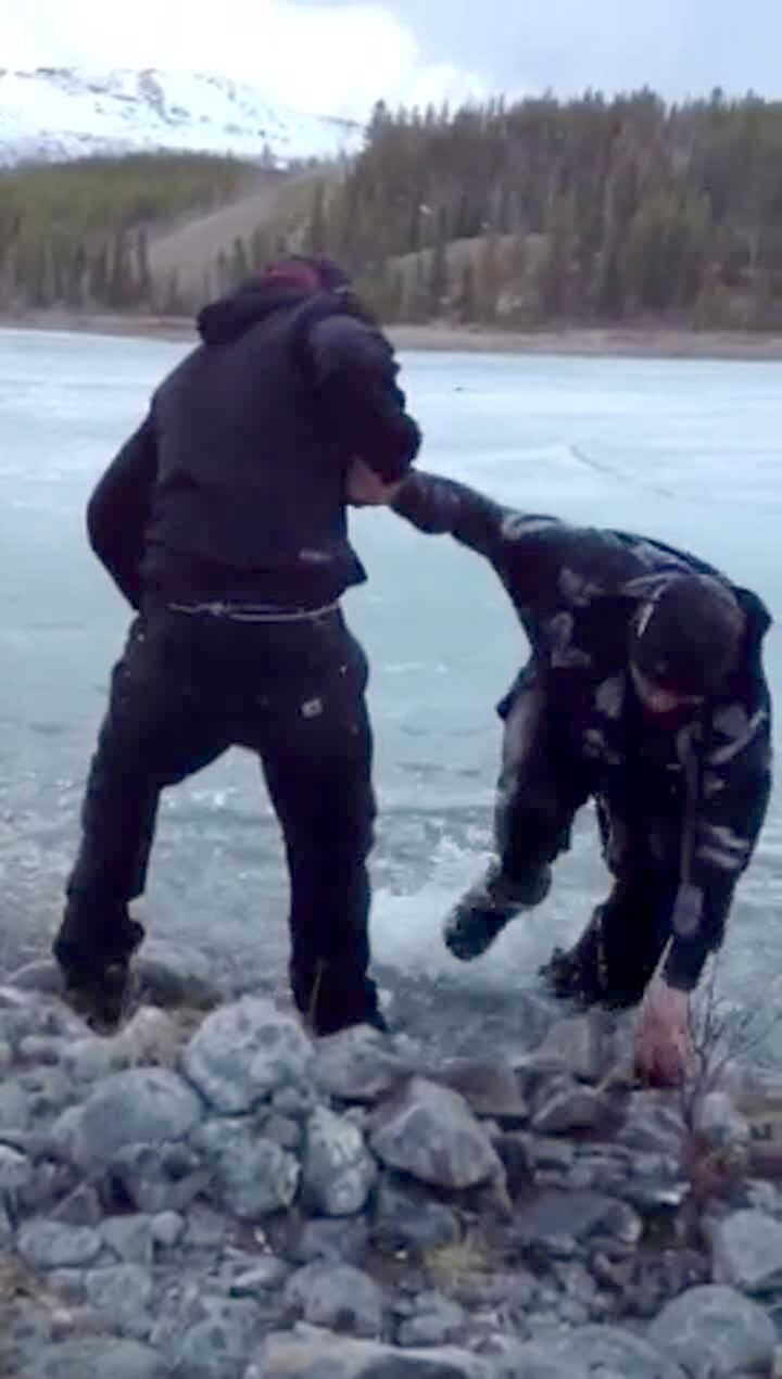 A man is running across a frozen lake. At 0:07, he slips and falls and breaks the ice, getting wet.